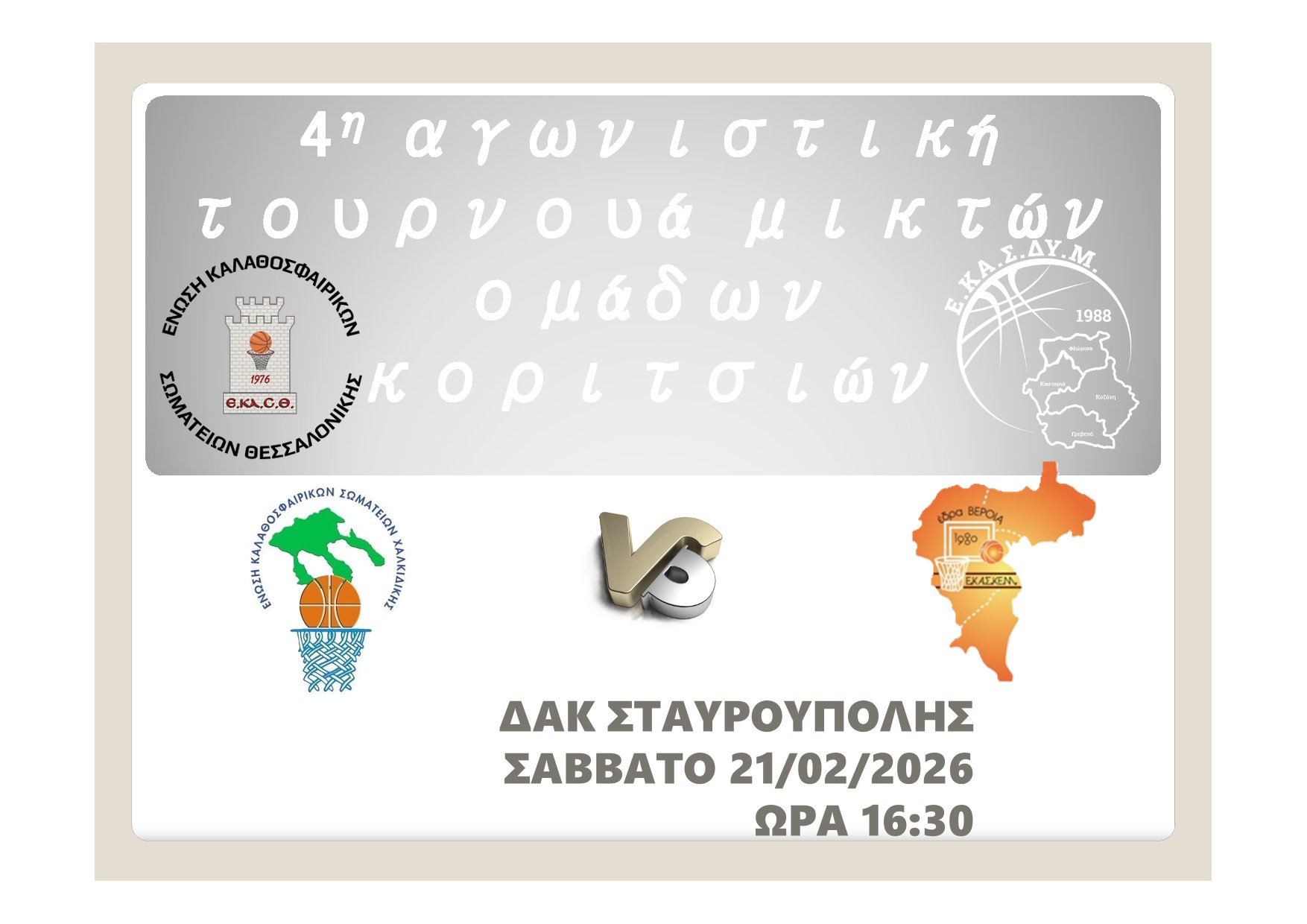 Το Σάββατο 21 Φεβρουαρίου 2026  στην Σταυρούπολη Θες/νίκης, θα πραγματοποιηθεί η 4η Αγωνιστική του Τουρνουά Ενώσεων & Τ.Ε./Ε.Ο.Κ.